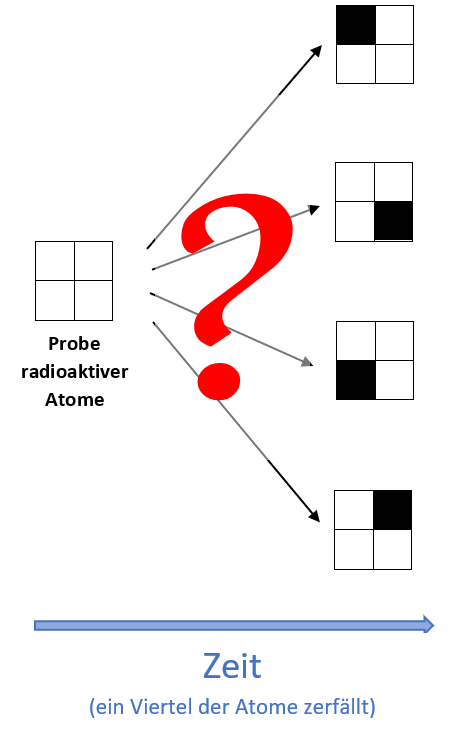 Der Zerfall radioaktiver Atome ist also nicht kausal determiniert, wohl aber statistisch. Und so hat die Statistik auch in die harten Naturwissenschaften Einzug gehalten. Dagegen ist auch nichts einzuwenden, denn die Vorhersagen habe sich zigtausendfach im Experiment bewährt. Nur: Dass damit alles geklärt sei, das kann man nun nicht behaupten. Die Frage, welches Viertel der Atome zerfallen wird, ist nach wie vor ungeklärt, wie die Abbildung zeigt.