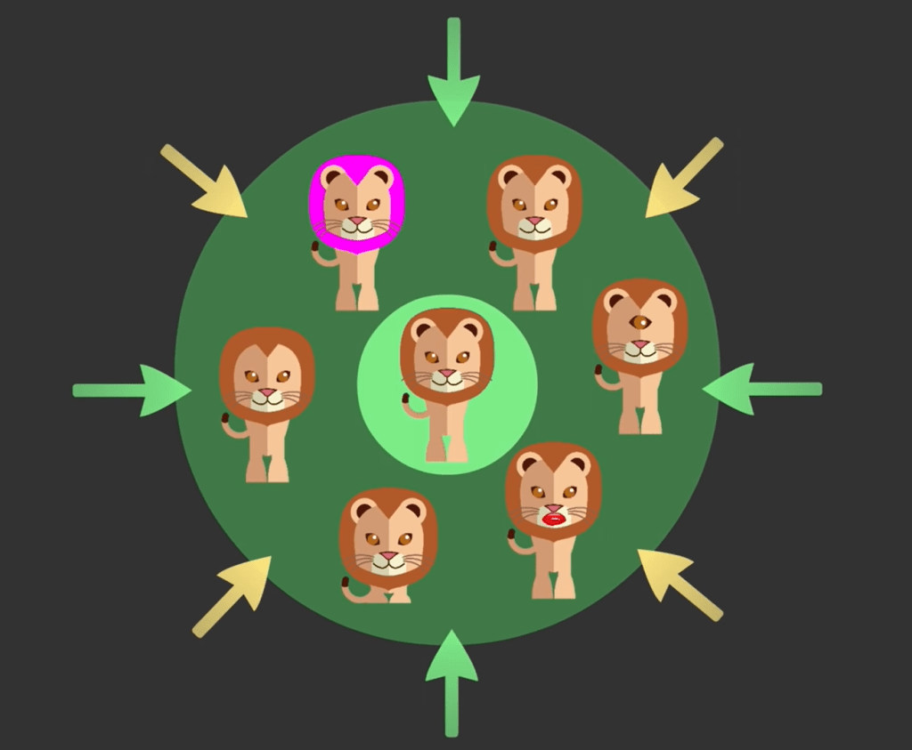 Prinzip der Evolution: Aus einer Variation von Individuen wird durch Umwelteinflüsse (Pfeile) dasjenige ausgewählt, das am besten angepasst ist (Mitte). (Bild: youtube screenshot)